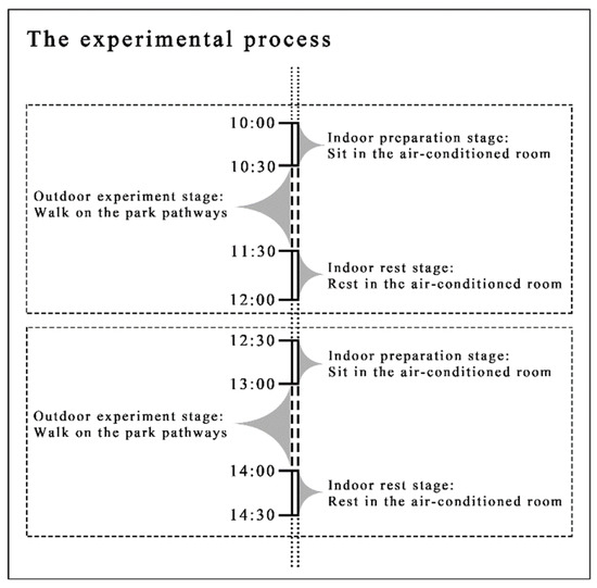 A date when the maximum daily temperature was close to 28 °C was selected for the experiment time, with the measured temperature data of the experiment day as follows: The average air temperature during the experiment on the water-friendly sunshine pathway group was 27.23 °C and the average air temperature during the experiment on the tree-shaded pathway group was 27.70 °C, both of which were close to Harbin’s average summer maximum temperature of 28 °C. Therefore, the environmental climate on the test dates of this experiment had the typical climate characteristics of Harbin in summer.