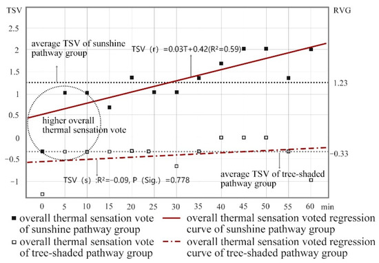 In Figure 7, TSV (r), TSV (s), and T, respectively, represent the overall thermal sensation value voted by subjects in the sunshine pathway group, overall thermal sensation voted value by subjects in the tree-shaded pathway group, and the walking time.