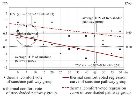 In Figure 8, TCV (r), TCV (s), and T, respectively, represent the thermal comfort value voted by subjects in the sunshine pathway group, the thermal comfort value voted by subjects in the tree-shaded pathway group, and the walking time.