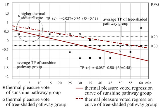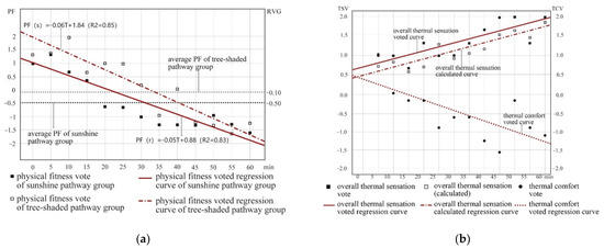 The thermal comfort vote of subjects in both sunshine and tree-shaded pathway groups showed a negative linear correlation with walking time (Figure 8). With an increase in time, people’s thermal comfort declined.