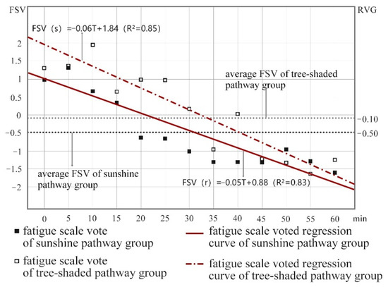 There was a high negative linear correlation between the fatigue scale votes of subjects in both sunshine and tree-shaded pathway groups and walking time.
