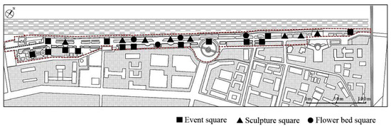 The layout of the recreation facilities at Stalin Park is shown in Figure 12, while in Figure 13, 62 chairs are arranged along the tree-shaded pathway in a zonal distribution. In terms of the continuity, the layout could meet the requirement of 30 min walking distance but could only accommodate 186 people simultaneously at most, which is not enough when the number of people walking in Stalin Park in summer is considered. A total of 26 squares are set as landscape nodes along the pathway, including 12 sculpture squares and flower bed squares, which were built as landscape markers, and 14 event squares. The designer should consider adding rest seats and spaces, as well as creating some concentrated rest spaces to improve the capacity of the recreation place.