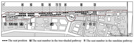 A total of 36 seats in the sunshine pathway are arranged linearly along the river, which meet the requirements of 20 min walking distance according to the layout continuity. However, the seats could only accommodate 108 people resting at the same time, which means that the sunshine pathway faced the same problem of a lack of rest space as the tree-shaded pathway. Because the sunshine pathway is linear space and the seats’ arrangement is relatively continuous, the design of rest facilities on the sunshine pathway should consider the combination of the addition of concentrated rest spaces and sunshade viewing facilities.