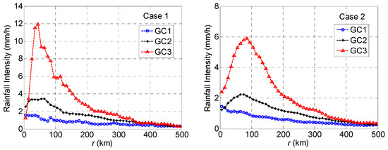 By minimizing the error defined in Equation (9), the obtained model parameters are shown in Table 2 for the grouped intensity categories (i.e., GC1, GC2, and GC3) and different cases. Based on the estimated model parameters, the predicted rainfall intensity is shown in Figure 3 for selected values of Rmax and Vmax. Since the mean presented in Figure 2 for GC1, GC2, and GC3 is obtained by considering TCs with different Rmax and Vmax (and snapshots with incomplete coverage of the rainfall intensity field), the results shown in Figure 2 and Figure 3 should not be compared quantitatively. However, the qualitative trends of the rainfall intensity in the radial direction shown in Figure 2 and Figure 3 are consistent. Also, the results shown in Figure 2 indicate that the predicted rainfall intensity is sensitive to Rmax and Vmax. An increase in Rmax and Vmax leads to increased predicted azimuthally average rainfall intensity. In all cases, the use of the model parameters developed based on TMI-TRMM leads to the predicted azimuthally averaged rainfall intensity that is less than the one predicted using the model developed based on PR-TRMM. However, it must be emphasized that the predicted rainfall accumulation by considering the passage of a TC event depends on the azimuthally averaged rainfall intensity and the asymmetric component of the rainfall intensity.