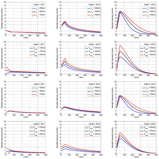 Predicted azimuthally averaged rainfall intensity using the model parameters shown in Table 2. For the plots where Vmax is shown, rm equals 60, 50, and 40 km for GC1, GC2, and GC3, respectively. For the plots where rm is shown, Rmax equals 15, 30, and 45 m/s for GC1, GC2, and GC3, respectively.