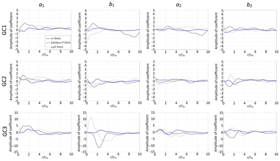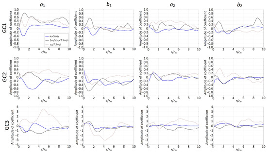 To assess the asymmetric component of the rainfall intensity field, we retain the terms associated with wavenumber 1 and 2 to represent , as shown in Equation (3), but replace the Fourier coefficients ak(r) and bk(r) with ak(r/rm) and bk(r/rm). This replacement is consistent with the parametrization used for I0(r) shown in Equation (10). The Fourier coefficients can be calculated using and the Fourier series properties. The resulting coefficients for GC1, GC2, and CG3 are shown in Figure 4 and Figure 5 for Case 1 and Case 2, respectively. The figures show that the Fourier coefficients vary radially and depend on the grouped intensity categories. For each case, the largest amplitude of the Fourier coefficients occurs for GC3, indicating that the asymmetric rainfall intensity for GC3 is likely to be more severe than that for GC1 and GC2.