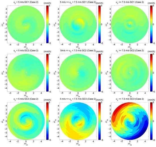 Asymmetric rainfall fields calculated based on the model coefficients shown in Figure 5 for Case 2.