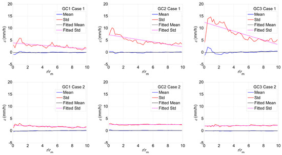 By using the developed models and the considered snapshots, the mean and standard deviation of the residuals, ε(r/rm), are calculated and shown in Figure 8. Part of this residual is due to the consideration of only the first two wavenumbers in the Fourier series expansion. The results shown in Figure 8 indicate that the mean is near zero, indicating that the developed empirical model for the rainfall intensity is almost unbiased. In addition, the standard deviation decreases as r/rm increases. The decrease in the standard deviation can be explained by noting that the rainfall intensity decreases as ε(r/rm). The mean and standard deviation may be approximated by a linear function as shown in Figure 8 with the parameters given in Table 3.