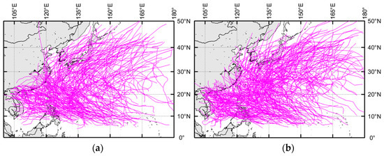 Illustration of the TC tracks for a period of 10 years: (a) Using historical TC tracks from 2001 to 2010 based on the historical catalogue given in Ying et al. (2014) and (b) Using synthetic TC tracks generated by applying the model given in Li and Hong (2016) for a period of 10 years.