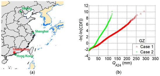 As an illustration, the above-outlined procedure is used to assess the accumulated rain hazard by using the synthetic tracks for a period of 25,000 years. For the assessment, the site (i.e., Guangzhou referred to as GZ) shown in Figure 10a, and the rainfall intensity model for Case 1 (i.e., based on the data from PR-TRMM) is considered. The assessed maximum accumulated rain per 24 h, Q24, that is caused by each TC for the site (i.e., Guangzhou) is evaluated. The annual maximum of Q24, denoted as QA24, is extracted from the samples for each year and is presented in Figure 10b.