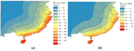 The obtained results are presented in Figure 11. The results indicate that the obtained values for Case 1 are greater than those for Case 2. The ratio of the former to the latter is about 1.6, which is consistent with that observed in Figure 10 for Guangzhou. However, this is greater than that inferred from Figure 9 (i.e., I0(r)), which is about 1.4. This discrepancy may be explained by noting that the standard deviation of the residual for Case 1 is about twice that for Case 2. The standard deviation also affects the estimated extreme value of the accumulated rain hazard.