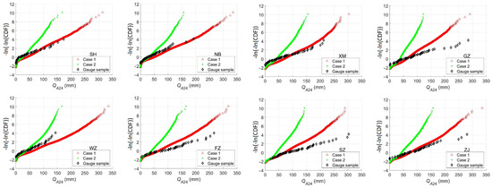 Comparison of QA24 due to TC rainfall for selected sites on the Gumbel probability paper, where the vertical axis represents the value of −ln (−ln(CDF)) in which CDF denotes the value of the (empirical) cumulative probability distribution function (CDF).