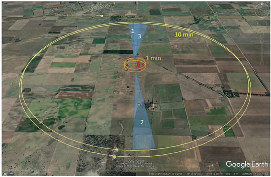 Location of the measuring field and travelled distance of air and particulate matter for both measuring points at the test field (green rectangle) for a wind velocity of 6 m s−1 and different measuring intervals (red circles: 6 s—highest temporal resolution of the EDM164; orange circles: 1 min—regular interval of the EDM164; yellow circles: 10 min—common interval of long-term meteorological measurements); blue sectors mark the wind directions of the three considered events.