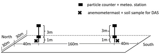 The measurements took place between March and December 2016, of which 6 days with continuous measurements are in the focus of this study. The selection was made according to the prevailing wind direction of the day; only days were selected on which the wind came in the direction of the longitudinal orientation of the measurement field, in this case from north or south. Due to the opposite wind directions, we do not address the station “north” and “south” in the ongoing manuscript, but rather name “IN” and “OUT” instead. The measurement equipment was setup as shown in Figure 2. A comprehensive description of the study site can be found in [11].