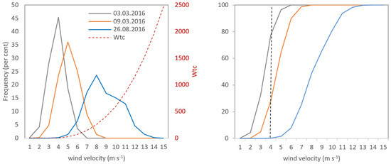 The standard for estimating the mean wind, set by the WMO, is the 10 min average [13]. At the beginning of our campaign, we measured three events with the highest temporal resolution of 5 s (03.03., 09.03. and 26.08. 2016). We average (upscale) these values from 5 s measuring to 1 min intervals in order to compare the results between the two setups: 5 s and 1 min averages. This analysis is used to analyze the influence of the measuring intervals on mean wind velocity. These three events cover a wide range of wind velocities and can be considered as weak, medium, and strong events. The frequency distribution of the measured wind velocities is shown in Figure 3; the frequency of each velocity class is on the left side, the summarized curves are at the right side. The wind velocity is 4 m s−1 (measured in a height of 1 m); the threshold shows that during the event at 03.03.2016 just 20% of all winds were above the threshold, about 70% at the 09.03.2016 and almost all wind velocities were above the threshold at the 26.08.2016 (Figure 3, right panel). It must be noted that the 4 m s−1 threshold is only used for illustration purposes here, the value is not used for any further statistical analyses. Taking into account earlier work from [34], the threshold is a rather variable value depending on meteorological conditions. Hence, the threshold can range between low values in winter and high values in autumn.