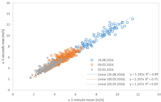 The relationship between the maximum wind velocity of the 5 s intervals and the 1 min averages is shown in Figure 4. In general, all events are on the same line, with a slight increasing tendency of the 5 s maxima at higher values of the 1 min averages, which is reflected in the increasing values of the slopes (m) of the regression lines. The maximum wind peaks are 18 to 24% higher than the averages, with a decreasing tendency at increasing average wind velocity. If these slopes are regarded as the gust factor, they are closer to the recommended conversion factors for open sea than for land surfaces [37].