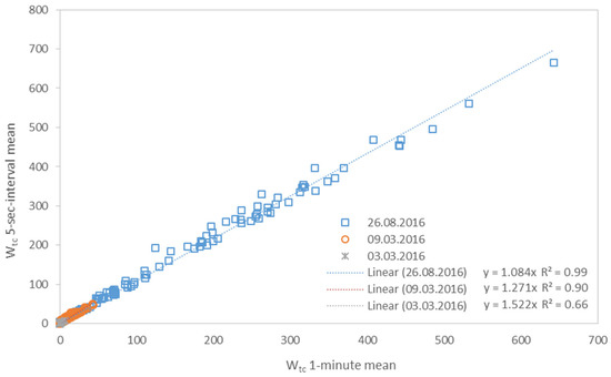 The comparison of the transport capacity of the wind (Wtc) calculated from the 1 min averages and the mean of the 5 s intervals shows similar decreasing differences at increasing wind velocity (Figure 5). The weak event at the 03.03.2016 has a 52.2% higher transport capacity if the 5 s intervals are used for calculation, the medium event has 27.1%higher values, and the strong event comes even closer to the values of the 1 min averages, with only 8.4% higher values. This shows again that longer average time intervals cut the peaks of wind speed and therefore to a greater extent the transport capacity, which is derived from wind speed by an exponential relationship [38,39]. Lower wind speeds are more affected because individual wind peaks tend to be eliminated completely due to averaging.