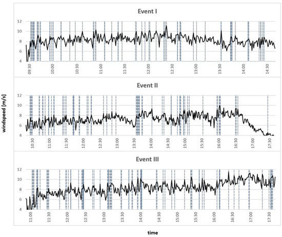 Wind speed during all three events. Grey bulks mark wind gusts following the gust definition described above.
