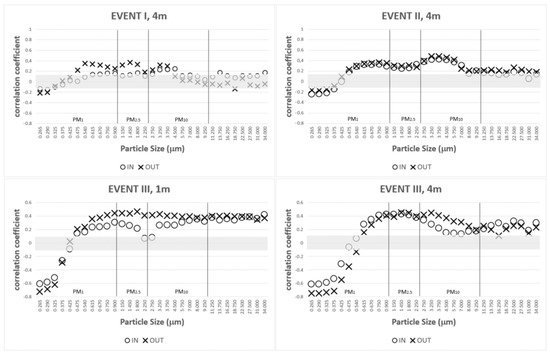 Linear Pearson correlation coefficients for the 1 min measurements between wind speed and particle counts for 31 particle size classes. The grey shadow indicates non-significant correlation coefficients (α = 0.05). At Event I and II the 1 m particle count data were lost during the field campaign and cannot be shown here. For comparison reasons, the respective particulate matter classes are also displayed.