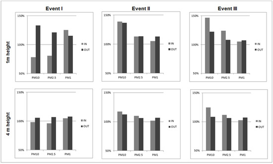 In Figure 8 the results of the calculations of the Gust uptake Efficiency (GuE) for the three particulate matter classes and for both “IN” and “OUT” stations are shown. At 1 m height, the values generally show larger differences, both between the particulate matter classes and the “IN” and “OUT” positions, whereas the values are generally more balanced in 4 m height. The GuE for all events is clearly over 100% on the 1 m height measurements (except for Event I, “IN”) and closer to, yet still over 100% on the 4 m height measurements. This clearly shows that the transports at a height of 1 m can be assigned to the processes of erosion or sedimentation of the measurement field, whereas the particles at the height of 4 m rather originate from sources outside. It is also possible that particles are carried out of the sampling space by turbulent, vertical movement, see [40]. Regarding the particle sizes, a tendency for higher values for bigger particles can be seen, specifically at Events II and III.