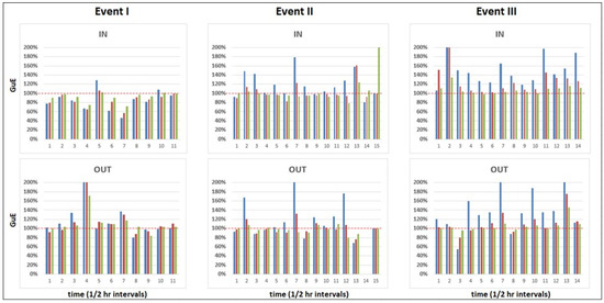 Because the results of Figure 8 are quite heterogeneous between the three events, we increased the temporal resolution of the analysis for Figure 9 and calculated the GuE for 30 min time windows. Since the events occurred over different time spans, this results in 11–15 time windows per event.
