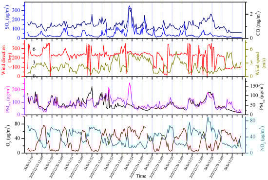 Temporal profiles of gaseous pollutants (O3, SO2, CO, and NO2), wind direction, wind speed, and PM2.5 and PM10 mass concentrations.