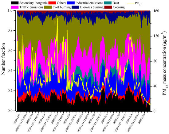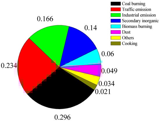 The number fractions for each group are illustrated in Figure 4. During the sampling period, the atmosphere was mainly affected by coal burning (29.6%) and traffic emissions (23.4%). Industrial emissions and secondary inorganic particles accounted for 16.6% and 14.0% of aerosols, respectively.