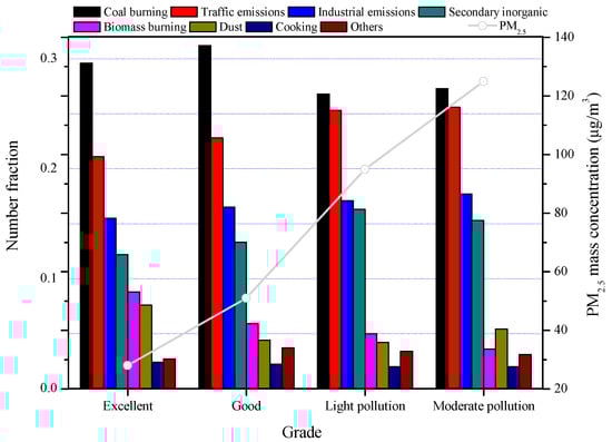 According to national ambient air quality standards (NAAQS) for particulate matter (PM) in 2012 (GB3095-2012), air quality is categorized on the basis of PM2.5 values as follows: 0–35 μg/m3, excellent; 35–75 μg/m3, good; 75–115 μg/m3, slight pollution; 115–150 μg/m3, moderate pollution; and 150–250 μg/m3, severe pollution. In our sample, the air quality was divided into four grades: excellent, good, slight pollution, and moderate pollution. Figure 5 presents the number fractions of the eight particle types under various pollution cases. As the average PM2.5 mass concentration increased from 28 to 95 μg/m3, the air quality changed from excellent to slight pollution, the number fraction of traffic emissions increased from 21.1% to 25.3%, and the number fraction of secondary inorganic sources increased from 12.2% to 16.3%. As the average PM2.5 mass concentration increased from 95 to 125 μg/m3, the air quality changed from slight pollution to moderate pollution, the number fraction of coal burning increased from 26.8% to 27.3%, and the number fraction of dust increased from 4.2% to 5.4%. These findings indicated that the increase in PM2.5 during the sampling period was influenced mainly by the increase in coal burning, traffic emissions, secondary inorganic aerosols, and dust.