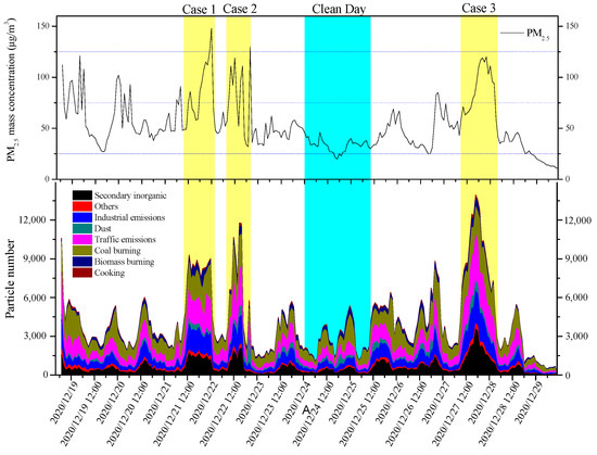 The number concentrations of ambient aerosols detected using the SPAMS changed rapidly and in a complex pattern (Figure 6). The high-resolution temporal variation in the eight types of number concentration indicated several peaks, which may have been due to the typical fresh plume or municipal air pollution. As illustrated in Figure 7, strong correlation (R2 = 0.51109) between the number concentration of ambient particles collected using a SPAMS and PM2.5 mass concentration indicated that the concentration of ambient particles determined using the SPAMS can reflect the atmospheric pollution status of fine particles. To illustrate this point, we defined the periods from 11:00 to 24:00 on 21 December, 09:00 to 17:00 on 22 December, and 10:00 on 27 December to 04:00 on 28 December, as Cases 1, 2, and 3, respectively. From 0:00 on 24 December to 10:00 on 25 December, the PM2.5 mass concentration remained at a low level (<35 μg/m3), so we defined this period as the “Clean Day”. Figure 8 presents the temporal variation in the number fraction of ambient particles and in the PM2.5 mass concentration with 1 h resolution. To better illustrate the phenomenon, the three cases (Cases 1, 2, and 3) are colored yellow, whereas the “Clean Day” is colored blue. In this study, we will focus on three pollution cases. The contributions of the eight particle types in the three cases are summarized in Figure 9.