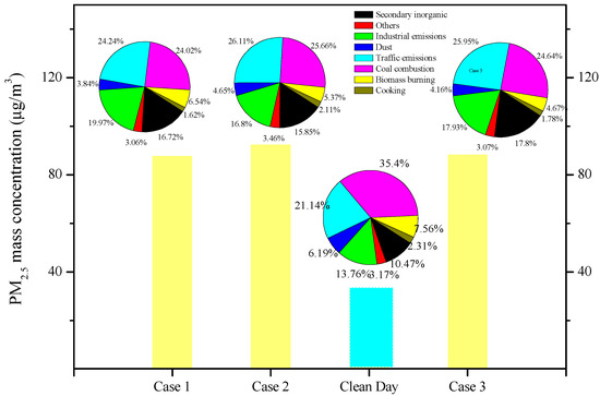For Cases 1, 2, and 3, both the particle number concentration detected by SPAMS and PM2.5 mass concentration increased sharply with respect to time (PM2.5 = 87.75, 92.38, and 88.32 µg/m3, respectively; Figure 7). The PM2.5 mass concentrations for the three cases, represented by the height of the bar chart, were higher than 75 µg/m3 (Figure 9), indicating slight pollution. The number fraction of traffic emissions on the Clean Day and in Cases 1, 2, and 3 was 21.14%, 24.24%, 26.11%, and 25.95%, respectively. The number fraction of industry emissions on the Clean Day and in Cases 1, 2, and 3 was 13.76%, 19.97%, 16.8%, and 17.93%, respectively. The number fraction of secondary inorganic pollution on the Clean Day and in Cases 1, 2, and 3 was 10.47%, 16.72%, 15.85%, and 17.8%, respectively. All three of these parameters were higher for the pollution cases than on the Clean Day, indicating that slight pollution was caused by traffic emissions, industry emissions, and increased secondary inorganic conversion.