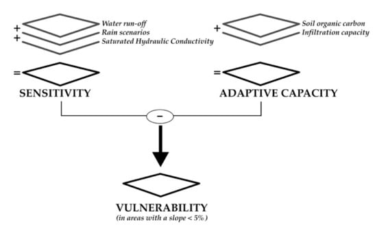 Based on the approach shown in the IPCC 2014 “vulnerability assessment” report [45], the methodology aims to identify areas vulnerable to flooding in rural contexts, by innovative synergy [12]. The Equation (1) is based on the analysis of sensitivity, adaptive capacity and vulnerability as follows: