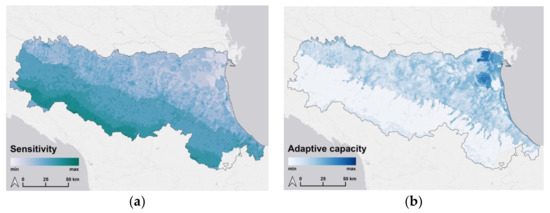 “Sensitivity” (a) and “Adaptive Capacity” (b). Sensitivity is “the degree to which a system is affected, either adversely or beneficially, by climate-related stimuli. The effect may be direct (e.g., a change in crop yield in response to a change in the mean, range or variability of temperature) or indirect (e.g., damages caused by an increase in the frequency of coastal flooding due to sea level rise).” Adaptive capacity is “The ability of a system to adjust to climate change (including climate variability and extremes) to moderate potential damages, to take advantage of opportunities, or to cope with the consequences” [54]. In this figure, as the scale of blue increases, the areas that are more sensitive (a) and with more adaptive capacity (b) to the phenomenon analyzed are identified.