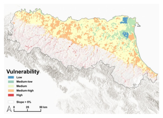 In this figure, the areas depicted in blue represent “Low Vulnerability”, while those in red representing “High Vulnerability”. The areas in the administrative boundaries of the Emilia Romagna region shown in white have a slope >5%.