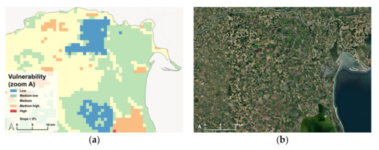“Vulnerability”: zoom A (a) and satellite view (b). In this figure, the areas depicted in blue represent “Low Vulnerability”, while those in red represent “High Vulnerability” (a). Figure (b) is the satellite view of the area.