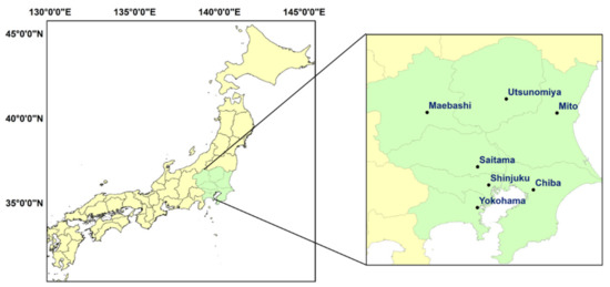 Location of Kanto in Japan and the seven evaluated points.