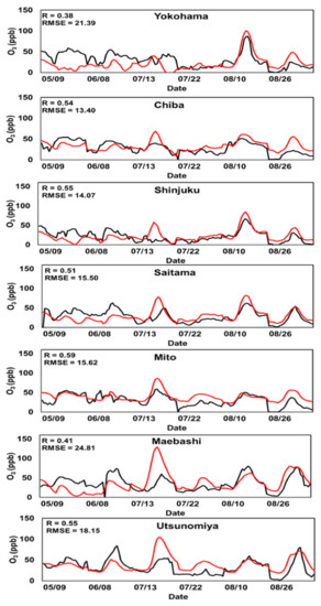 The agreement in the dataset improved when comparing the hourly average for the O3 season, as shown in Figure 3. The correlation factors ranked from 0.8 to 0.96, and the RMSE was also reduced. Similar to the hourly data, the concentrations in Mito, Maebashi, and Utsunomiya (suburban areas) were overestimated by the model, and the more urbanized areas of Shinjuku and Saitama displayed lower RMSE, indicating better data agreement. Nevertheless, the data comparison showed that the model effectively reproduced the O3 concentrations at the compared points.
