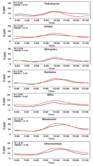 Hourly O3 concentrations from the observational and model-derived data were compared to evaluate the performance of the model. The observed data were retrieved from the Atmospheric Environmental Regional Observation System (AEROS) of the Ministry of Environment of Japan. The modelled data were extracted from a grid cell containing the selected location. The hourly values for the entire period and hourly averages were compared. Pearson correlations and the root mean square error (RMSE) were calculated to evaluate the agreement between the observations and modeled data. Seven monitoring stations dispersed in the Kanto region were chosen for data comparison. The selected stations were the capital cities of Yokohama, Chiba, Shinjuku, Saitama, Mito, Maebashi, and Utsunomiya. These seven points are distributed in the urban and suburban areas of the Kanto Plain.
