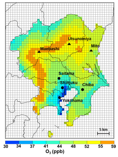 Figure 4 shows the 8 h (10:00 to 18:00) average O3 concentrations in Kanto for the BASE scenario during the O3 season. Higher O3 levels were observed in the western and northwestern Kanto region than those in the central region. Most of the areas with higher O3 levels were suburban sites (Maebashi, Utsunomiya, and Mito) with lower precursor emissions (Figures S2 and S3). In contrast, areas with higher precursor emissions (i.e., Tokyo and Yokohama) displayed lower O3 levels.