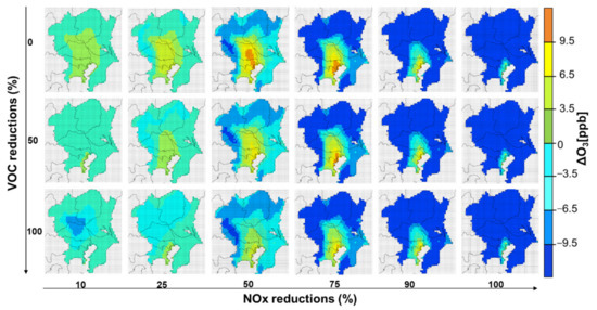 The O3 differences between the reduction scenarios and the base year are shown in Figure 5. The maps were arranged as a function of the percentages of NOx and VOC. There is marked heterogeneity in O3 responses between the suburban and urban areas of Kanto. The suburban regions showed a decreasing tendency in most of the scenarios, and major decreases were found when NOx emissions were reduced by >50%. Areas with decreased O3 levels expanded as NOx emissions reductions increased. Conversely, the urban regions showed an increasing pattern when NOx emissions were reduced by >25%, and the increasing trend peaked when high NOx reductions were mixed with no VOC level changes. For example, when NOx emissions were reduced by 50% with no reduction in the VOC emissions, an increase of >9.5 ppb was observed in the urban core of Kanto and an increase between 6.5 and 9.5 ppb was observed in the rest of the Greater Tokyo Area.