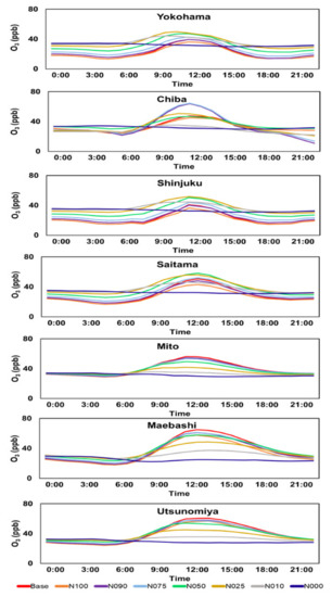 The points in the urban core (Yokohama, Shinjuku, and Saitama) only showed reductions when VOC emissions were reduced without modifying NOx emissions (N100V050, N100V000). Reductions between 1% and 9% of the mean values were observed. However, when NOx emissions were reduced by >10%, the mean O3 levels increased. In VOC-limited areas, O3 production efficiency increased as NOx concentrations decreased. In addition, O3 titration by NO (NO + O3 → NO2 +O2) is an important process that influences the daily patterns of O3 concentration in VOC-limited areas. Therefore, O3 depletion through titration decreases when NOx emissions are reduced, causing an increase in ground O3 levels.