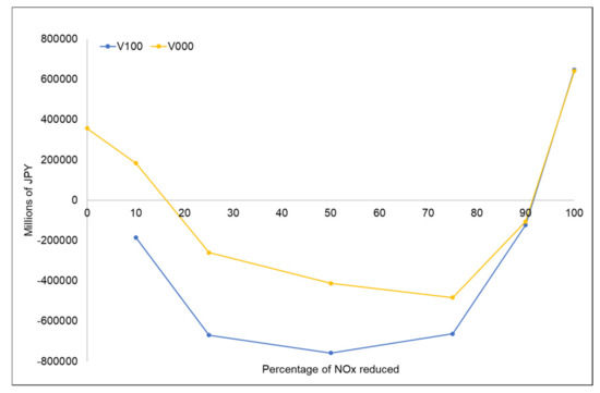 Figure 7 and Figure 8 show the economic change divided into health and crop benefits for all ranges of NOx reduction in two of the evaluated VOC reductions (V100 and V000). When mixing small NOx reductions with significant VOC reductions (V100), the health benefits were positive. Subsequently, a transition to negative impacts was observed when NOx reductions were >25% and was sustained until reductions were at 75%. Subsequently, when NOx emissions were reduced by >90%, the economic change was positive again. The benefits achieved when NOx was reduced by >90% were independent of the VOC reductions; this implies that under significant reductions in the NOx emissions, changes in the VOC are not crucial for achieving a positive impact on the health benefits. The achieved economic change when NOx was reduced by >90% is more significant than when NOx was not reduced. However, studies evaluating the mortality risk associated with long-term exposure to O3 [56] report significant uncertainties that should be considered when selecting a good strategy based on the health impacts of O3 reduction.