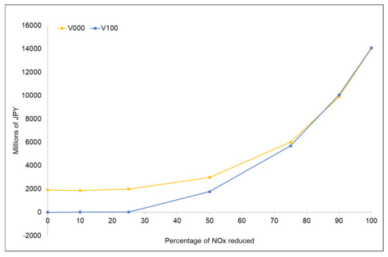 Moreover, the benefits related to rice production showed a direct relationship with the NOx cuts, increasing as the NOx reductions became more significant. The benefits were the highest when NOx reductions were at maximum (>75%); from this point, VOC emissions reductions did not influence the economic change. When reductions in NOx emissions were <25%, the economic impacts remained unchanged in each VOC scenario (V000 and V100). Nonetheless, entirely reducing VOC emissions (V000) mixed with NOx emissions <25% has greater economic benefit than that when VOC are not reduced (V100).