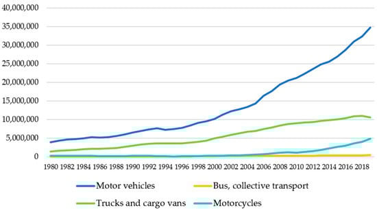 The exploratory analysis of polluting emissions from mobile sources involves two parts: (1) a multivariate analysis aiming to reduce the dimensions using a principal component analysis (PCA) of pollutant gas emissions and (2) an exploratory spatial autocorrelation analysis of emissions and cars as the main source of mobile emissions. Figure 1 shows the evolution of registered cars in circulation at the national level from 1980 to 2019.