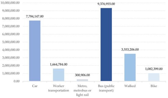 According to the 2015 INEGI Intercensal Survey, the occupied population (32%) took between 16 and 30 min to commute to and from work, while 10% took more than an hour [37]. This figure suggests that the occupied population of metropolitan municipalities travels over long distances, moves to a different municipality facing traffic or traffic jams, or uses more than one means of transport. Figure 3 shows the main means of transport used by the occupied population.
