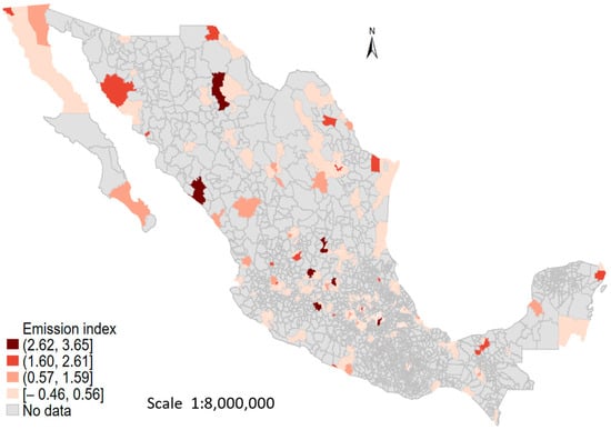 Emissions index for 405 metropolitan municipalities in Mexico in 2016.