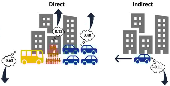 Greater urban growth and economic dynamism in the CBDs of metropolitan municipalities favor increases in the number of vehicles in circulation that generate vehicular traffic, an increase in local emissions and lower emissions in neighboring municipalities with different urban environment characteristics. This generates negative spillover effects on emissions. Figure 5 shows a flowchart of the direct and indirect spatial effects of the number of vehicles, population density, and greater use of buses with respect to private cars on emissions.