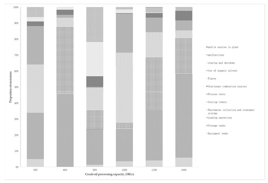The contributions of VOC emissions from various sources to the total emissions of the 21 investigated enterprises with six processing capacities are illustrated in Figure 2. Equipment leaks, storage tanks, loading operations, process vents, and wastewater systems cover more than 90% of the total enterprise VOC emissions. Several previous studies have shown that more than 80–90% of the VOC emissions of different PR industries in China were concentrated in equipment leaks, storage tanks, wastewater treatment systems and loading transport [34,35,36,37]. Among these 12 sources, storage tanks, loading operations and wastewater collection and treatment systems are dominant. Based on the information collected from 21 enterprises, this paper calculates emissions from 12 sources by applying the model formula method, measured method, and the material balance and emission coefficient method.