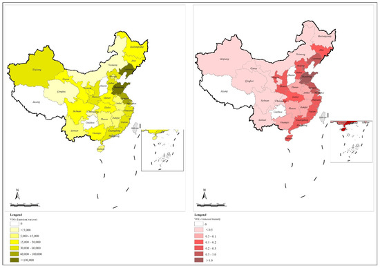 Distribution of VOC emissions and emission intensity per unit land area in the PR industry in China.