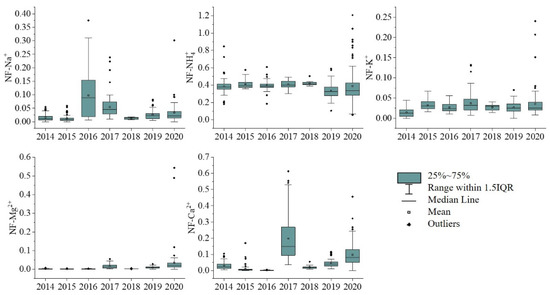 Except from 17 July to 19 July 2017 and 19 July to 22 July 2020, K+ had a neutralization factor greater than 0.1; the remaining days exhibited values between 0.0–0.1. The value of Mg2+ neutralization factor in July 2017 was higher than that in June and August, and the value of Mg2+ neutralization factor in June and July 2020 was higher than that in August and in other years during the same period. The neutralization factor of Ca2+ varied greatly in 2017 and 2020; it was the highest in July 2017, and the values in July and August 2017 were the highest of all years in the same period. Large amounts of Ca2 + in the atmosphere could be due to its high concentration in local soil [34]. Only the value on 12 June 2015 increased from 0.02 to 0.16; other years exhibited relatively stable and low values. Combining the above neutralization factors, the neutralization factors of all cations showed little change in 2015. The changes in K+, Mg2+, and Ca2+ were relatively large in 2017 and 2020.