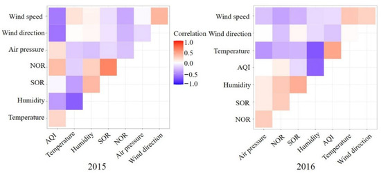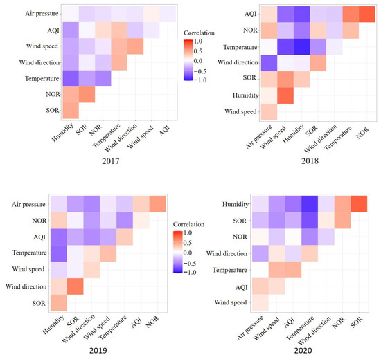 The results for NOR are similar to those for SOR. From 2015–2020 (except 2018), there was a positive correlation between NOR and relative humidity, with correlation coefficients of 0.25, 0.28, 0.55, 0.25, and 0.44 for 2015, 2016, 2017, 2019, and 2020, respectively. The correlation with temperature was negative with coefficients of −0.2, −0.34, −0.53, −0.49, and −0.51 for 2015, 2016, 2017, 2018, 2019, and 2020, respectively. The correlation with wind speed was also negative with correlation coefficients of −0.37, −0.4, −0.1, −0.26, −0.15, and −0.22 for 2015, 2016, 2017, 2018, 2019, and 2020, respectively. This indicated that low temperature, high humidity, and low wind speed are ideal conditions for nitrate conversion and for NO2 to convert to NO3−.